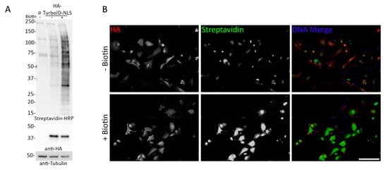The observed lack of practical induction of biotinylation in the TurboID cells was considerably different than prior reports which used transient transfection to express TurboID [34]. We hypothesized that perhaps the transient transfection approach prevented a slow accumulation of biotinylated proteins over time that would be expected to occur in cells stably expressing TurboID for many days or weeks. In an attempt to reproduce this rapid induction of biotinylation observed with transient transfection we utilized a mammalian expression vector containing 3xHA-TurboID-NLS (Addgene plasmid #107171) for transient transfection in A549 cells. 24 h after transfection, the cells were either incubated without biotin supplementation or were supplemented with excess biotin for 10 min at 37 °C. WB analysis revealed clear biotinylation without the addition of biotin and a considerable increase in biotinylation following the 10 min biotin supplementation (Figure 8A). Furthermore, IF confirmed biotinylation of proteins within the nucleus as well as throughout the cytoplasm of several cells, both with and without biotin supplementation (Figure 8B). These results support the use of low-expressing, stable cell lines for BioID/TurboID studies to reduce protein mislocalization due to gross and variable overexpression, and although the inducibility of biotinylation is improved compared to stable ligase expression, this suggests a persistent lack of practical inducibility of biotinylation in cells transiently expressing the TurboID ligase.