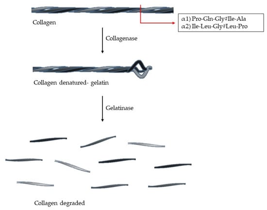 Its triple helix conformation makes collagen resistant to many proteases. The enzymes able to cleave this structure are capthesin K and enzymes with collagenolytic activity (MMPs-1, -2, -8, -13, -14, and -18) [3,4]. The collagen type I, II and III have a specific cleavage sequence: (Gln/Leu)-Gly#(Ile/Leu)-(Ala/Pro), which is located at 3/4 of N-terminal and this is crucial for collagen degradation [6,7] (Figure 3). The denatured collagen is called gelatin, which can be further degraded by gelatinases [4,6]. The collagen degradation is involved in many biological processes, such as embryogenesis, morphogenesis, tissue remodulation, angiogenesis, and wound healing [4].