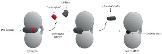 MMPs are produced by various tissues and cells [1]. MMPs are secreted by connective tissue, pro-inflammatory and uteroplacental cells, such as fibroblast, endothelial cells, osteoblasts, vascular smooth muscle, macrophages, lymphocytes, cytotrophoblasts, and neutrophils [1]. MMPs are synthesized as pre-proMMPs, from which the signal peptide is removed during translation to generate proMMPs or zymogens [1]. MMPs are secreted in the form of latent precursors- “zymogens”, which are proteolytically activated in extracellular medium [1,2,6,13,14,16,17,18,19,24]. The important activation mechanism is the proteolytic removal of the pro-domain by endopeptidases, such as, other MMPs, serine proteases, plasmin or furin [1,11,12,13,14,15,16,21]. The first proteolytic attack occurs in the “bait region” [8,19,24] and the specificity of cleavage is dictated by a sequence found in each MMP [9,12,18]. This leads to the removal of part of the pro-domain, destabilizing the rest of the pro-domain [13], including cysteine switch-zinc interaction [17,24], which allows intramolecular processing [8,9,12,18]—“stepwise activation” [8,18] (Figure 11). One question that remains unanswered is how a simple bait-region cleavage can result in destabilization of the pro-domain and cause conformational changes in the zone between the pro-domain and the catalytic domain [13].