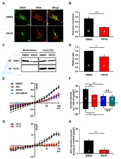 We previously demonstrated that the ANO1 chloride channel was highly expressed in U251 cells and that its surface expression was critical for their migration [10]. Therefore, it seems that the ANO1 channel may be a primary target for the effects of KN-93 in these cells. To confirm this possibility, we next examined the effect of KN-93 on the surface expression and channel activity of ANO1 in U251 cells. Immunocytochemical data showed that treatment with KN-93 led to a prominent reduction in ANO1 localization at the plasma membrane of U251 cells (t-test; p = 0.0008) (Figure 2A,B). ANO1 and WGA647, a fluorescent-labeled wheat germ agglutinin labeling membrane glycoprotein (or glycolipid), are rarely co-localized in U251 cells under the treatment of KN-93, whereas ANO1 is clearly co-localized with WGA647 at the plasma membrane of naïve U251 cells. The comparison of Pearson’s correlation coefficients showed that ANO1 expression at the plasma membrane was significantly reduced by treatment with KN-93. In addition, the surface biotinylation assay also confirmed that KN-93 treatment caused a significant reduction in ANO1 surface expression without affecting the total ANO1 protein levels in U251 cells (t-test; p = 0.014) (Figure 2C,D). We also found that the chloride currents of U251 cells were prominently inhibited by treatment by KN-93 or T16Ainh-A01, an ANO1-specific inhibitor (Figure 2E,F). Figure 2G,H shows that the A01- sensitive chloride current was almost completely inhibited by KN-93. These data demonstrated that the surface expression and channel activity of ANO1 were reduced by KN-93, a selective CaMKII inhibitor, in U251 glioblastoma cells.
