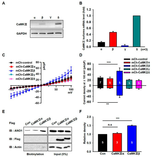 We next analyzed the expression of CaMKII isoforms in U251 cells. RT-PCR experiments demonstrated that the mRNA levels of CaMKIIβ and CaMKIIδ were higher than those of CaMKIIα and CaMKIIγ in U251 cells (Figure 3A,B). To identify which CaMKII isoforms are critical for the channel activity of ANO1, we examined the chloride currents in U251 cells transfected with CaMKII isoforms. As shown in Figure 3C,D, endogenous chloride currents were specifically increased by mCherry-tagged CaMKIIβ (mCh- CaMKIIβ) compared to those of other isoforms. Although CaMKIIδ was the most highly expressed isoform of the CaMKII family in U251 cells, only CaMKIIβ was shown to affect the increase of chloride currents in U251 cells. In addition, the surface biotinylation assay showed that only CaMKIIβ overexpression significantly increased the surface expression of ANO1 in U251 cells (t-test; p = 0.0005) (Figure 3E,F and Figure S1). These data clearly demonstrated that only CaMKIIβ among the CaMKII family members was involved in the surface expression and channel activity of ANO1 in U251 glioblastoma cells.