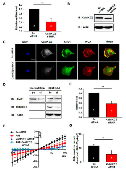 We examined the effects of CaMKIIβ knockdown on the surface expression and channel activity of endogenous ANO1 in U251 cells using CaMKIIβ siRNA. The knockdown efficiency of CaMKIIβ siRNA was examined by qPCR and Western blotting experiments (Figure 4A,B). The mRNA and protein levels of endogenous CaMKIIβ were clearly reduced by approximately 60% following treatment with CaMKIIβ siRNA.
