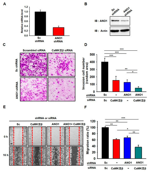 We recently reported that surface expression and channel activity of ANO1 are critical in the tumorigenesis of U251 cells [10]. Since ANO1 surface expression and chloride currents were regulated by CaMKIIβ in U251 cells, we examined whether gene silencing of CaMKIIβ or ANO1 affect the characteristics of cancer cells, such as invasion and migration. First, we examined the knockdown efficiency of ANO1 shRNA, which was examined by qPCR and Western blotting experiments (Figure 5A,B). The mRNA and protein levels of endogenous ANO1 in U251 glioblastoma cells were clearly reduced by approximately 70% following treatment with ANO1 shRNA.