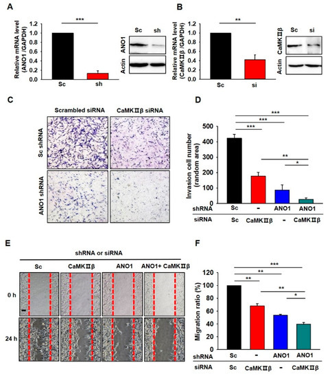 Finally, we examined whether the deficiency of CaMKIIβ or ANO1 also affects other glioblastoma cells. We tested the roles of CaMKIIβ and ANO1 in the tumorigenesis of U87 MG cells which is another glioblastoma cell showing high expression of ANO1 [22]. As shown in Figure 6A,B, both ANO1 shRNA and CaMKIIβ siRNA successfully suppressed the mRNA and protein levels of their targets. The invasion assay and wound-healing assay in U87 MG cells also demonstrated that depletion of ANO1 or/and CaMKIIβ exhibited similar effects (Figure 6).