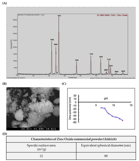 A commercial ZnO nanopowder (<100 nm) (Sigma-Aldrich, Saint Louis, MO, USA) was used. The structure of the powder was characterized by X-ray diffraction (XRD) using a Panalytical X’Pert Pro Diffractometer (PANalytical B.V., Almelo, The Netherlands) with Cu Kα1 radiation (λCu = 0.154056 nm). The XRD patterns were recorded in the range of 10–80° of 2q values, with a 0.02° step and time per step of 3 s. The powder specific surface area was accessed by gas adsorption (BET isotherm) in a Micromeritics-Gemini V2380 surface area analyser (Micromeritics, Norcross, GA, USA). Scanning electron microscopy (SEM) was performed to analyse the powder morphology using a Hitachi SU-70 Scanning Electron Microscope (Hitachi High-Tech, Tokyo, Japan). The particle surface charge was also accessed by measuring the Zeta potential of ZnO aqueous suspensions at different pHs in Coulter Delsa 440 SX equipment (Beckman Coulter, Indianapolis, IN, USA).