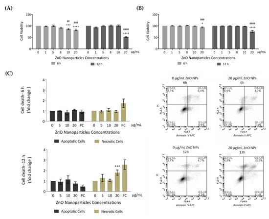 The cell death was measured by flow cytometry analysis of Annexin V/PI. For these assays, GC-1 cells were collected 6 h and 12 h after exposure to 0, 5, 10, and 20 µg/mL of ZnO NPs. The cell suspension was centrifuged at 1000 rpm for 3 min at 4 °C, and the cell pellet was resuspended in binding buffer (1× PBS with Ca2+ at a concentration of 0.33 g/L). Further, a centrifugation at 1000 rpm for 3 min at 4 °C was performed, the supernatant was discarded, and the cell pellet was resuspended in binding buffer with conjugated recombinant Annexin V (Annexin V-APC, Immuno Tools, Friesoythe, Germany). Cells were exposed to Annexin V-APC for 15 min in the dark. Finally, propidium iodide staining solution (PI; BD Pharmingen™, San Jose, CA, USA) (100 µg/mL) was added, and cytometry analyses were performed using a BD AccuratiTM C6 (BD Biosciences®, San Jose, CA, USA). Proper negative and positive controls were also analyzed. For the negative control, cells were incubated without annexin V-APC or PI. For positive control, cells were treated with 100 µM of hydrogen peroxide (H2O2) for 2 h and stained with annexin V-APC and PI. The results were analysed using a BD AccuratiTM C6 Software (BD Biosciences®).