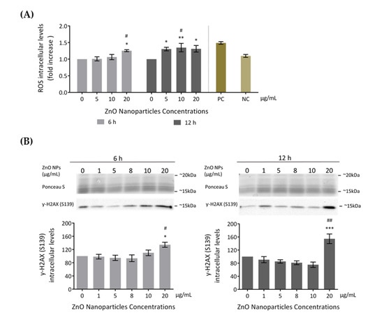 DNA damage in GC-1 cells is enhanced in the presence of higher concentrations of ZnO NPs after 6 and 12 h of exposure. The increase in γ-H2AX phosphorylated at Ser139 (Figure 4B) by protein kinase ATM (mutated in ataxia-telangiectasia) leads to the recruitment of the mediator of DNA damage checkpoint protein 1 (MDC1) as a response to the formation of double strand breaks (DSB). Therefore, DNA damage response (DDR) leads to cell repair and chromatin decondensation, increasing the accessibility of DNA to transcription and repair and the activation of checkpoint proteins which arrest the cell cycle progression [43]. Therefore, y-H2AX (S139) levels fluctuate over time, increasing exponentially in the first few min after the DSB and decreasing after a few hours [48]. In the present study, DNA damage was evaluated after 6 and 12 h of exposure to ZnO NPs and the results clearly indicate that the amount of γ-H2AX (S139) significantly increases with higher ZnO NP concentration upon 12 h of exposure. It is important to note that additional studies for monitoring full DNA damage after short times of exposure to ZnO NPs are recommended and should be addressed in future studies.