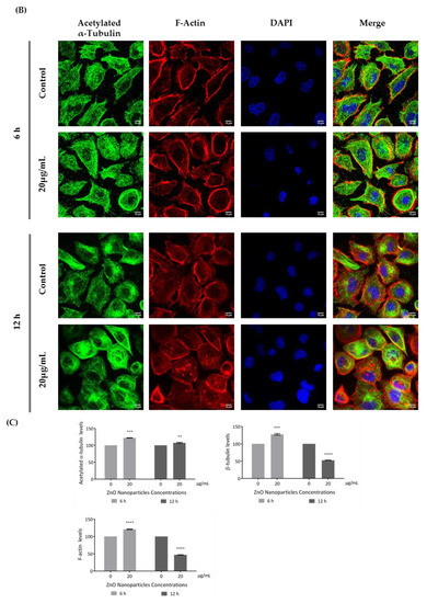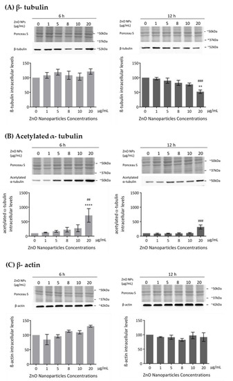 According to the immunocytochemistry analysis, microtubule and microfilament protein levels changed after GC-1 cell exposure to 20 µg/mL of ZnO NPs for 6 and 12 h (Figure 6). The actin dynamics of GC-1 cells was monitored by F-actin, a specific marker of actin polymerization. β-tubulin (* p ≤ 0.001) and F-actin (* p < 0.0001) increased significantly after 6 h of ZnO NP exposure to 20 µg/mL. However, after 12 h, GC-1 cells presented a significant reduction of β-tubulin (* p < 0.0001) and F-actin (* p < 0.0001) levels with the highest concentration tested relative to control cells. Moreover, at 6 h of ZnO NP treatment, GC-1 cells showed an increase of acetylated α-tubulin levels (* p ≤ 0.001) with 20 µg/mL. Similarly, after 12 h of ZnO NP exposure, acetylated α-tubulin levels also increased significantly (* p < 0.01) with the same concentration.
