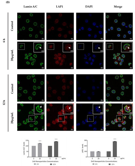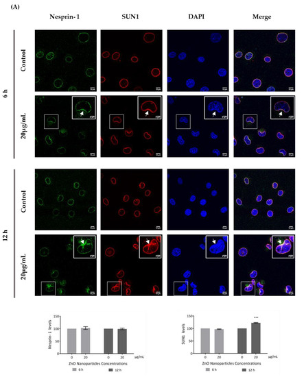 This is an interesting result that was, for the first time, subsequently pursued by the evaluation of the effects of ZnO NPs on the nucleoskeleton (nuclear lamina, and NE proteins) in spermatogonia cells. SUN1, nesprin 1, lamin A/C, and LAP1 are highly relevant proteins for spermatogenesis, as reviewed in Pereira et al. [29], for which levels and distribution were evaluated by immunocytochemistry (Figure 7). Visible alterations of the basal levels and distribution of these proteins occurred after GC-1 cells exposure to 20 µg/mL of ZnO NPs. According to the present results, the levels of nesprin-1 (Figure 7A) did not change in the presence of ZnO NPs; however, SUN1 (* p ≤ 0.001) (Figure 7A) and LAP1 (* p < 0.0001) (Figure 7B) levels increased significantly in GC-1 cells exposed to ZnO NPs for 12 h. Further, lamin A/C increased significantly (* p < 0.0001) in GC-1 cells exposed to ZnO NPs for 6 h and 12 h (Figure 7B). In addition, it is important to note an increase in nesprin-1, SUN1, and LAP1 in areas of nucleus confinement and, on the contrary, lamin A/C decrease at these sites (Figure 7, arrows).