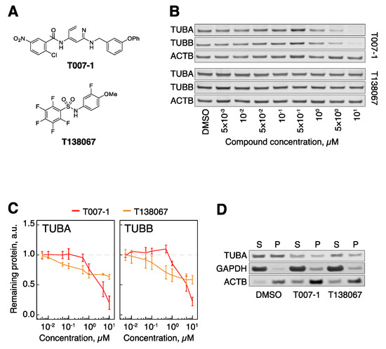 As positive controls, we prepared two of the literature molecules, T007-1 and a related T138067 (Figure 2A) [35]. We modified the originally reported synthesis of T007-1, instead using 2-chloro-5-nitrobenzoyl chloride, as the reported dicyclohexyl carbodiimide (DCC) coupling with 2-chloro-5-nitrobenzoic acid led to inseparable mixtures of mono- and diacylation (See Supplementary Material for full details). We treated human retinal pigment epithelium 1 (hTert-RPE1) cells, a widely used cell model, with T007-1 and T138067 degraders at a range of concentrations from 5 nM to 10 μM. Prolonged compound treatment was expected to cause activation of the spindle assembly checkpoint and an arrest in the mitotic stage of the cell cycle [40], which could have an effect on tubulin levels independently of tubulin degradation. To exclude this possibility, we used contact-inhibited quiescent cells (hTert-RPE1 cells stop proliferating at high growth density) [3]. In addition, to minimize the probability that some cells escape the cell cycle arrest and continue to proliferate, we opted for a short 5 h treatment of cells with the compounds, which was previously reported to be sufficient to degrade tubulin [35]. Western blot analysis of α-tubulin (TUBA) and β-tubulin (TUBB) revealed that both compounds induced a decrease in tubulin levels, with T007-1 being significantly more potent in our hands (Figure 2B,C). Our follow-up analysis of the effects of these compounds showed that T007-1-induced degradation of TUBA and TUBB led to decreased levels of both soluble (S) and polymerized (P) fractions of tubulin (Figure 2D). Therefore, as previously reported, this series of compounds led to degradation of tubulin and a global decrease of both soluble and polymerized tubulin levels. These results served as a benchmark for our studies of PROTAC molecules.