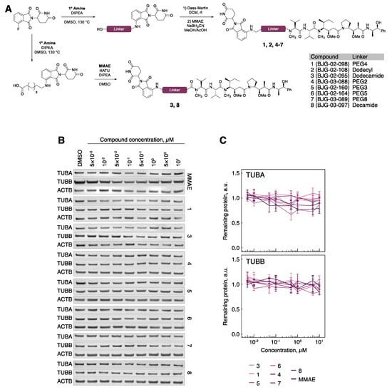 Small molecules that result in degradation of α- and β-tubulin are not without a precedent in the current literature [34,35,36]. It has been known for some time that molecules that covalently modify Cys-239 on β-tubulin lead to loss of both α- and β-tubulin, and that this process is mediated by the proteasome [35,36]. Thus, given the stated challenges surrounding existing microtubule-targeting modalities, and the evidence that small molecule-mediated tubulin degradation is achievable, we set out to develop tubulin-targeting PROTACs. We synthesized and tested a panel of PROTACs based on monomethyl auristatin E (MMAE, vedotin) or combretastatin A-4 (CA4) as tubulin-ligands, and cereblon (CRBN) E3-ligase-binding small molecules, connected via linkers of various lengths and chemical properties. The reported covalent compounds, T007-1 [35] and T138067 [36], were used as benchmark reagents for establishing tubulin degradability. Our results show that tubulin remains resistant to degradation using CRBN-recruiting PROTAC degraders, suggesting potential limitations of the PROTAC technology when targeting highly abundant proteins with complex homeostasis.