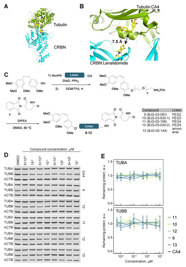 Despite the extensive structure–activity relationship (SAR) investigations that have been conducted on CA4 [41,42,43], relatively few examples contain long alkyl substituents at the 3′-hydroxyl position, although shorter substitutions at this position were found to reduce potency [44]. Given that the hydroxyl group forms a hydrogen bond with tubulin (Asn258, PDB ID 5lyj), we hypothesized that an amino-analogue of CA4 may display increased potency by retaining the ability to hydrogen bond. To this end, 13, a 3′-amino analogue of 11, was synthesized (Figure 4C and Supplementary Figure S5). While this compound showed efficient binding to CRBN (Supplementary Figure S6), it displayed no microtubule-destabilizing activity, as seen by unperturbed partitioning of tubulin into soluble and polymerized forms (Supplementary Figure S7), and was unsuccessful in degrading tubulin (Figure 4D,E).