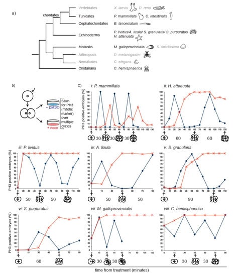 Nocodazole-induced spindle depolymerization defines two classes of embryos with qualitatively different mitotic responses. (a) Phylogenetic tree indicating phyla and species. Species analyzed in this study are in black, species for which information was obtained from the literature in grey. (b) Schematic representation of assay used to test mitotic progression. Two-cell stage embryos of selected species were treated either with DMSO or nocodazole and then fixed every 10–15 min for pH3 immunostaining. (c) Percentage of embryos accumulating pH3 in the presence of DMSO (blue) or nocodazole (red) over time (minutes indicated in x axis). Representative of 4 independent experiments, n = 50–200 embryos for each time point. Drugs were added when at least 90% of embryos were at 2-cell stage (t0). For M. galloprovincialis, control could not be quantified past 8 cells as divisions become asynchronous within each embryo. The duration of normal cell-cycle timing for each species is indicated under the corresponding graph.