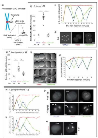 To confirm that the nocodazole-induced mitotic delay is due to SAC activation, we analyzed mitotic progression under conditions that compromised SAC activity. In the presence of spindle defects, the SAC kinase Mps1 binds to unattached kinetochores where it regulates the recruitment of other checkpoint components [25,26]. In somatic cells, inhibition of Mps1 activity leads to displacement of SAC components from kinetochores, checkpoint inactivation, and cell cycle resumption [25,27]. If the delay in mitosis observed in the presence of nocodazole is due to the activation of the SAC, then treatment with Mps1 inhibitors, like reversine [27], should restore mitotic timing in nocodazole-treated embryos, resulting in mitotic exit and cell cycle resumption (Figure 2a). For this analysis, we focused on a representative species from each animal group: P. lividus (Figure 2b–d), C. hemisphaerica (Figure 2e–g) and M. galloprovincialis (Figure 2h–k). When embryos completed first cytokinesis, we treated them with 10 µM nocodazole alone or in combination with 0.5 µM reversine and assayed mitotic progression using several markers (Figure 2a). Nocodazole alone caused an increase in mitotic index within 30 min of treatment, as evidenced by accumulation of cells with condensed chromosomes labeled with the mitotic marker pH3 (Figure 2c,g,i and Figure S2a), or of cells which lack nuclear membranes labeled with the nuclear pore component Nup-153 (Figure 2h). In nocodazole these mitotic indicators were all maintained for at least the equivalent of two cell cycle times. In all three species, reversine treatment shortened the nocodazole-induced mitotic arrest, resulting in chromosome decondensation (Figure 2j, Hoechst) and loss of chromatin associated pH3 staining (Figure 2c,g,i). In mussel embryos, mitotic exit after reversine treatment was further confirmed by nuclear envelope reformation (Figure 2h,j). In all three species, pH3-labeled chromosomes started to accumulate again at later time points, indicating that cells that exited mitosis upon Mps1 inhibition then resumed the cell cycle and entered a new mitosis. Similar results were also obtained using another Mps1 inhibitor, AZ3146 [28], further validating that the release of the mitotic arrest observed in those embryos is due to specific inactivation of Mps1 activity (Figure S2c,d).