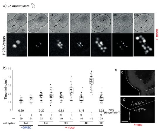 P. mammillata 2-cell embryos do not arrest in mitosis in the absence of spindle microtubules. (a) Selected frames from a time-lapse movie of a P. mammillata embryo expressing the DNA reporter, H2B-Venus, treated with 10 µM nocodazole after first cleavage. Numbers indicate minutes after treatment. Arrows indicate nuclei visible in bright field optics. See movie 1. (b) Duration of mitosis (M, NEB to NER) and interphase (I, NER to NEB) in P. mammillata embryos treated with DMSO or nocodazole. Kin/V indicates kinetochore to cell volume ratio at each cell cycle starting from fertilization (1st is 1-cell mitosis; 2nd is 2-cell mitosis). Box plot parameters as in Figure 2b. In nocodazole-treated embryos the amount of DNA increases due to subsequent rounds of DNA replication without intervening cytokinesis. Duration of mitosis in control DMSO-treated embryos is constant in all four analyzed cell cycles. (c) DAPI (4′,6-diamidine-2′-phenylindole dihydrochloride)-stained chromosome spreads from DMSO and nocodazole-treated (180 min) P. mammillata embryos. After 180 min nocodazole treatment, embryos have undergone 4 more cell cycles and have 4 times more DNA than at time 0. In the absence of microtubules, the nuclei which form around chromosome clusters (karyomeres) do not fuse and are dispersed over time by cytoplasmic flow (in (a,c)). Scale bar = 30 µm.