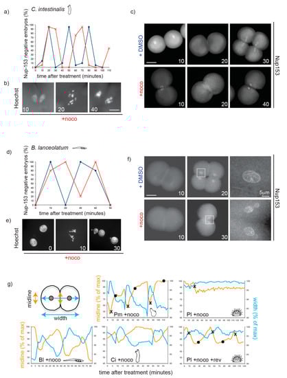 Nocodazole treatment does not delay mitotic progression during cleavage in chordate embryos. (a) Quantification of Nup153-negative C. intestinalis embryos (without nuclei = mitosis) in the presence of DMSO (blue) or nocodazole (red) over the time of 3 divisions (2–16 cells). Representative of 3 independent experiments. n = 20–30 embryos for each time point. (b) Representative C. intestinalis Hoechst-stained nuclei and (c) Nup-153-stained embryos. (d) Percentage of B. lanceolatum embryos without nuclei, as determined by Nup-153 staining, in the presence of DMSO (blue) or nocodazole (red) over the time of two divisions (2–8 cells). Representative of 3 independent experiments. n = 50–100 embryos per time point. (e) Representative B. lanceolatum Hoechst-stained nuclei and (f) Nup-153-stained embryos. Numbers indicate minutes after treatment. (g) Measurement of long axis of embryo (width, blue) and cell–cell contact region (midline, orange) during 2–3 cell cycles in a representative embryo of B. lanceolatum (Bl), P. mammillata (Pm, see movie 1), C. intestinalis (Ci), and P. lividus (Pl) in the presence of nocodazole (+ noco; movie 2) or for Pl nocodazole/reversine (Pl + noco + rev; movie 3). Measurements are reported as percentage of maximum length throughout the recording. Crosses (×) correspond to NEB, and circles (•) to NER. Scale bar = 30 µm, unless otherwise indicated.
