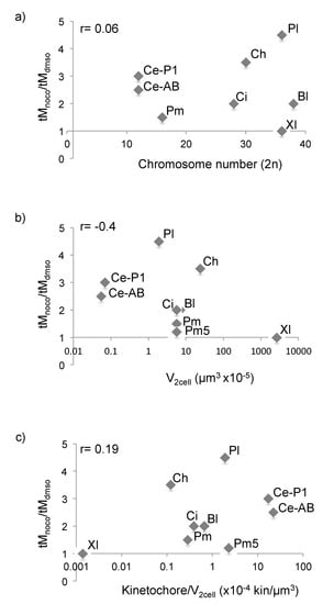 As it was previously shown that the strength of SAC response can be modulated by cell size [15], we asked whether the difference in mitotic response to spindle defects observed across species could be explained by the difference in cell size in early embryos, whose diameters range from tens of microns to millimeters depending on the animal species. We compared cell size, kinetochore number, and kinetochore to cell volume ratio at the 2-cell stage in all species used in our survey (Table 1). In this analysis, we used chromosome number as a proxy for kinetochore number.