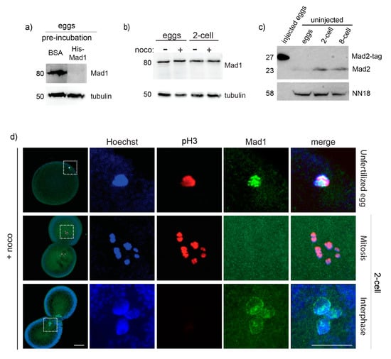 Eggs or embryos were fixed overnight in −20 °C 90% methanol containing 50 mM EGTA. After fixation embryos were washed 3 times in phosphate-buffered saline (PBS) containing 0.1% Triton X-100, preblocked in PBS containing 3% BSA for 1 h at room temperature, and then incubated overnight at 4 °C in PBS containing 3% BSA and the appropriate dilution of primary antibody. The mouse anti-pH3 (phospho S10, Abcam) antibody was diluted 1:1000, the rabbit anti-pH3 (phospho S10, Sigma-Aldrich) 1:2000, the mouse anti-Nup153 (Covance, Princeton, NJ, USA) 1:500, the mouse anti-tubulin DM1A (Sigma-Aldrich) 1:500, and the mouse anti-Mad1 (this study) 1:250. Following 3 washes in PBS-0.1% Triton X-100, embryos were incubated with specific fluorescently-labeled secondary antibodies at room temperature for 1–2 h. Following 2 further washes in PBS-0.1% Triton X-100, embryos were incubated for 10 min in PBS-0.1% Triton X-100 containing Hoechst (5 µg/mL), washed twice and then mounted in Citifluor AF1 (Science Services, München, Germany) for imaging and quantification. Each experiment was repeated 3–5 times and 25–200 embryos (depending on the species) were counted for each sample.