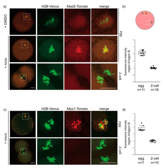 To quantify the localization of Mad2-Tomato or Mps1-Tomato proteins to mitotic chromatin in live eggs and embryos we generated Z-stack projections of the confocal planes containing DNA (generally 3 planes, 2 microns apart). Using ImageJ software (ImageJ 1.52 [23]), the red fluorescence intensity of a 7 × 7 µm square region was determined at both the location of the chromatin and a different location in the cell (three different cytoplasmic regions were averaged). The ratio of these two values (region DNA/region cytoplasm) is a measure of the enrichment of the fluorescent protein on chromosomes.