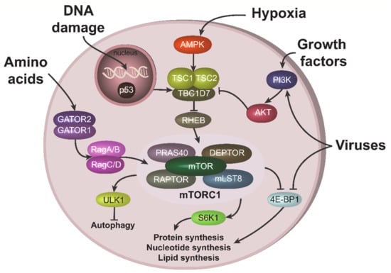 Viruses generate an environment that is favorable for their successful replication and transmission during infection. In order to optimize their biosynthetic needs, viruses use the nutrient, energy and macromolecule synthesis systems of the host cells and manipulate their metabolism [1]. Host cells in turn respond to viral infection by changing their transcriptional and translational programs and employing antiviral metabolic changes [2,3,4]. Cellular response to various stresses, including viral infection, is under the control of the mechanistic target of rapamycin complex 1 (mTORC1), which drives proliferation and survival by the regulation of anabolic and catabolic processes. Thus, it is no wonder that viruses try to use this signaling pathway to their benefit [4].