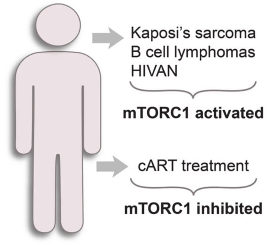Kaposi’s sarcoma is caused by a herpesvirus (KSHV or HHV8). Ectopic expression of the viral proteins K1 and vGPCR in primary human umbilical vein endothelial cells (HUVEC) was shown to activate PI3K-AKT-mTOR pathway, which plays a central role in Kaposi’s sarcomagenesis [51,102,103,104]. KSHV infection selectively upregulates mTORC1 signaling in primary human endothelial cells (LECs), but not in blood endothelial cells [105]. KSHV infection of LECs makes these cells dependent on the mTORC1 pathway for their survival, because the treatment of these cells with rapamycin triggers apoptosis. Interestingly, primary effusion lymphoma, a tumor of B cell origin linked to KSHV infection, was strongly inhibited by rapamycin both in vitro and in mouse models [106].