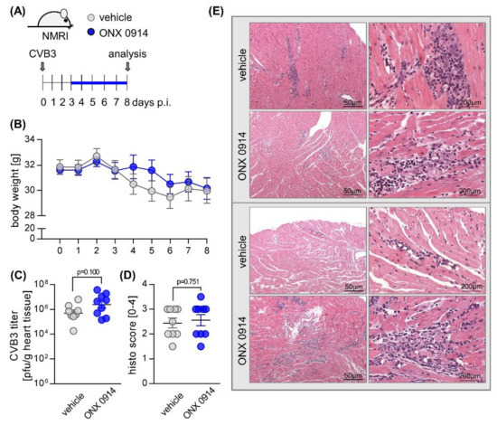 Effect of ONX 0914 on the manifestation of acute viral myocarditis in NMRI mice. (A) Mice were infected with 5 × 105 pfu CVB3 strain 31-1-93 (day 0). From day 3, mice received either ONX 0914 or vehicle daily until day 8. (B) Body weight was monitored as indicated. (C) Viral titers in hearts of both vehicle and ONX 0914-treated mice were determined by plaque assay. (D) Mice were then sacrificed, and heart tissue was analyzed microscopically for inflammation and fibrosis. (E) Histological images of two representative animals per group are shown. Data are summarized as mean ± SEM. Body weight was analyzed using two-way ANOVA, all remaining data were analyzed by unpaired t-tests.
