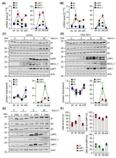 ONX 0914 preferentially bound to LMP7 and MECL-1, revealing comparably lower proportional inhibition of LMP2. Long-term treatment of mice with ONX 0914 for 28 days decreased the proportion of ONX 0914-bound i-proteasome subunits in comparison to earlier stages of infection (Figure 4F), which might indicate a loss of efficacy for ONX 0914 over time.
