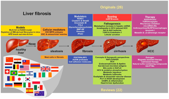 Topics covered in this Special Issue. The Special Issue “Cellular and Molecular Mechanisms Underlying the Pathogenesis of Hepatic Fibrosis” includes 26 original and 22 review articles written by 319 authors from 25 countries. These contributions discuss aspects of basic, clinical and translational research in the field of liver fibrosis. Special emphasis is given on the themes listed. Abbreviations used are: ADAM, a disintegrin and metalloproteinase; Akt1/2, serine/threonine-protein kinase 1/2; BM, bone marrow; BMP-8B, bone morphogenetic protein-8B; DAMPs; damage-associated molecular patterns; FHL2, four-and-a-half LIM-domain protein 2; HCC, hepatocellular carcinoma; HCV, hepatitis C virus; HFE, gene encoding the homeostatic iron regulator; HSC, hepatic stellate cell(s); iPla2β, Phospholipase A2; MFB, myofibroblast(s); mtDNA, mitochondrial DNA; NAFLD, nonalcoholic fatty liver disease; NASH, nonalcoholic steatophepatitis; NLRP3, NLR family pyrin domain-containing 3; Pin1, peptidyl-prolyl cis/trans isomerase, NIMA-interacting 1; P2X7R, purinergic receptor P2X; RUNX1, Runt-related transcription factor 1; TGR5, Takeda G-protein-coupled receptor 5; Ubl-PTMs, Ubiquitin-like post-translational modifications.