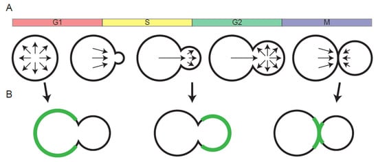 - Smits, G.J.; Schenkman, L.R.; Brul, S.; Pringle, J.R.; Klis, F.M. Role of Cell Cycle-Regulated Expression in the Localized Incorporation of Cell Wall Proteins in Yeast. Mol. Biol. Cell 2006, 17, 3267–3280. [Google Scholar] [CrossRef] [PubMed][Green Version]