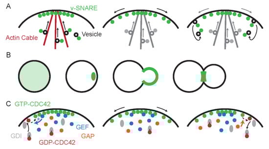 At the membrane, Cdc42 switches between GTP- and GDP-bound states in a manner assisted by GDP exchange factors (GEFs) and GTPase-activating proteins (GAPs) (Figure 2C). The Cdc42-directed GEF in yeast is primarily cytoplasmic, but associates with other proteins that allow it to be recruited to membrane sites with pre-existing GTP-Cdc42 [31]. This means that locations with some GTP-Cdc42 accumulate GEF, which loads GTP on neighboring Cdc42, creating a positive feedback loop that can drive symmetry breaking polarization. As GTP-Cdc42 diffuses, ubiquitous GAPs promote its conversion to GDP-Cdc42. GDP-Cdc42 can detach from the membrane to the cytoplasm, assisted by a GDP-dissociation inhibitor (GDI) [32] (Figure 2C) or via other poorly characterized pathways [33]. This enables rapid dissipation of any GDP-Cdc42 asymmetry via cytoplasmic diffusion. The preferential detachment of GDP-Cdc42 (compared to GTP-Cdc42) enables recycling of GDP-Cdc42 via the cytoplasm while maintaining a gradient of GTP-Cdc42 at the membrane (Figure 2C) [34,35,36]. This mechanism resembles the endocytic recycling mechanism of v-SNAREs (Figure 2A), but with rapid cytoplasmic diffusion allowing for much faster recycling that maintains the asymmetry of Cdc42 despite the higher diffusion of this peripheral membrane protein. In addition to cytoplasmic recycling, some studies have suggested that Cdc42 polarization is assisted by differential diffusion of Cdc42 at the plasma membrane.