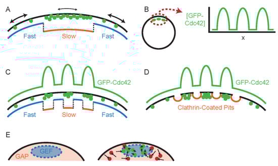 Other studies proposed a distinct scenario in which diffusion of any given Cdc42 molecule is similar at all locations, but different forms of Cdc42 (GTP-Cdc42 vs. GDP-Cdc42) have inherently different mobility [14,38]. Consider a situation in which GDP-Cdc42 diffuses more rapidly in the plane of the membrane than GTP-Cdc42 (Figure 3E). The positive feedback loop mentioned above (Figure 2C) would create a zone where GEF activity is elevated, so that most Cdc42 in that zone would be GTP-bound. Assuming that ubiquitous GAP activity keeps Cdc42 elsewhere mostly GDP-bound, the cell would develop a zone with slow (GTP-)Cdc42 diffusion surrounded by a membrane with rapid (GDP-)Cdc42 diffusion. As with the differential mobility that comes from preferential detachment of GDP-Cdc42 from the membrane to the cytoplasm, this version of differential diffusion enables (rather than dissipating) polarization, and can collaborate with positive feedback via GEF recruitment to concentrate Cdc42 at the polarity site.