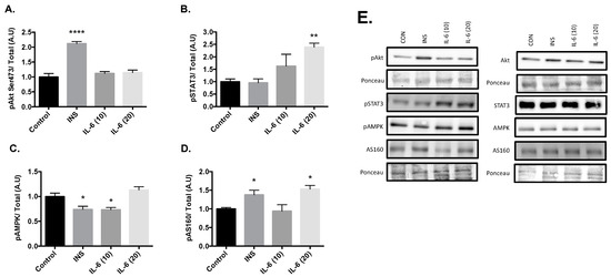 Protein concentrations in the cell lysates were determined using a bicinchroninic acid (BCA) quantification assay [53]. Equal amount of protein was loaded on polyacrylamide gels and separated by electrophoresis. Proteins from the gel were wet transferred onto nitrocellulose membranes for 1 h at 100 V on ice. The membranes were subsequently placed in a 5% dry milk-Tris-buffered saline/0.1% Tween 20 (TBST) blocking buffer for 1 h. Primary antibody was prepared at a 1:500 ratio in a 5% bovine serum albumin (BSA) and TBST solution, and membranes were incubated overnight on a rocker at 4 °C. Following the overnight incubation, the membranes were washed 3 × 5 min with TBST. The appropriate horseradish peroxidase secondary antibody was prepared in a 1:2000 1% milk solution before being added to the membranes, which incubated at room temperature for 1.5 h. Signals were detected using enhanced chemiluminesence and were subsequently quantified by densitometry using a Bio-Rad ChemiDoc imaging system. A representative Ponceau stain was analyzed in addition to a protein loading control (GAPDH) for each membrane to ensure equal loading (<10% variability across the membrane) [54]. Western blot analysis was used to examine protein content of proteins involved in the IL-6 signaling cascade, namely STAT3, pSTAT3, AMPK, pAMPK, ACC, pACC, AS160 and pAS160. Furthermore, proteins involved in the insulin cascade were also investigated, namely Akt and pAkt.
