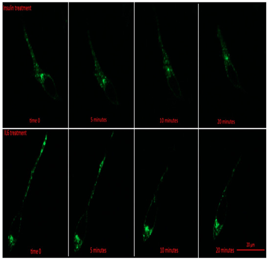 Prior to insulin or IL-6 treatment, GLUT4-GFP was found to be mainly in intracellular stores of the cell (Figure 3). Following 5 min, and all subsequent time points for both IL-6 and insulin treatments, total GFP fluorescence from intracellular stores significantly decreased compared to time 0 (p < 0.001) (Figure 4A). For both IL-6 and insulin treatments, GLUT4-GFP in intracellular stores significantly decreased further when comparing 5–10 min post-treatment (p < 0.018) as well as 10–20 min post-treatment (p < 0.045) (Figure 4A).