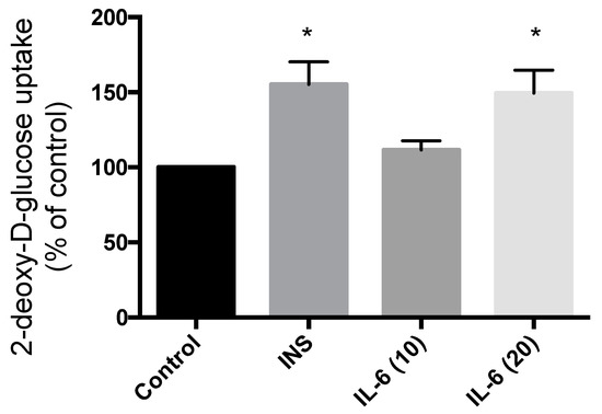 Treatment of SH-SY5Y cells with 100 nM insulin for 30 min resulted in significant increase in glucose uptake (55.2% increase compared to control; p = 0.0063) (Figure 5). Exposure to 10 ng/mL IL-6 for 30 min did not have any effect on the glucose uptake (11.6% compared to control; p = 0.53) (Figure 5). However, exposure to 20 ng/mL IL-6 for 30 min resulted in a significant increase in glucose uptake to levels comparable to insulin (49.4% increase compared to control; p = 0.011) (Figure 5). These data indicate that IL-6 exhibits an insulin-like effect to increase glucose uptake in SH-SY5Y neuroblastoma cells.