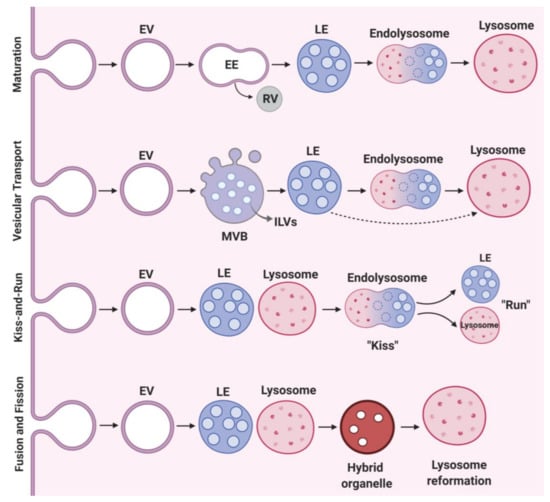 Lysosomes are 0.2–0.3 μm in diameter. Primary lysosomes originate from the Golgi apparatus. Current literature describes multiple models of lysosomal biogenesis. The first model of lysosome biogenesis describes the formation of early endosomes (EEs) from the plasma membrane, and their progressive maturation to late endosomes (LEs) and lysosomes [18,19]. The second model involves vesicular transport, where endosomal carrier vesicle/multivesicular bodies (ECV/MVBs) transfer cargo from early to late endosomes to lysosomes or directly from the matured LEs to lysosomes [18,19]. The third model denotes the “kiss and run” event wherein, LEs (“kiss”) form a contact site with lysosomes transferring cargo with ensuing dissociation (“run”) of lysosomes and LEs [18,19]. The fourth model of lysosome biogenesis is purported to be a fusion-fission event involving a heterotypic fusion of LEs-lysosomes to form hybrid organelles, followed by lysosome re-formation (Figure 1).