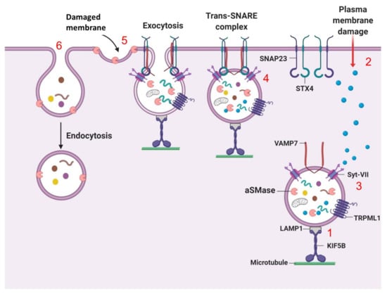 Lysosomes also regulate secretory vesicles through lysosome exocytosis. Exocytosis of the lysosome involves two main steps: (1) lysosomal movement to the cell periphery for plasma membrane (PM) fusion, and (2) exocytosis of the luminal content of the lysosome into the extracellular milieu. Lysosomal exocytosis is paramount for various cellular physiological processes such as PM repair (PMR), immune response, bone resorption and cell signaling [162]. PM integrity is lost upon injury, resulting in unlimited exchange of intra- and extra-cellular components triggering cell death; thus, PM repair is crucial for the maintenance of cellular homeostasis. Upon PM injury, cytoskeletal and motor proteins induce trafficking of lysosomes to the damaged PM at the cell periphery, wherein lysosomes fuse directly with the PM and empty their content into the extracellular space [107]. PM damage induced by exposing Hela cells to mechanical stress, triggers the colocalization of the motor protein KIF5B (Kinesin5 subfamily member) with LAMP1-positive lysosomes, which are then mobilized towards the cell periphery (Figure 4, step 1) [163]. Depletion of KIF5B in Hela cells causes lysosome immobilization and peripheral lysosome aggregation, signifying that motor proteins possess an important role in lysosomal mobilization during exocytosis [163].