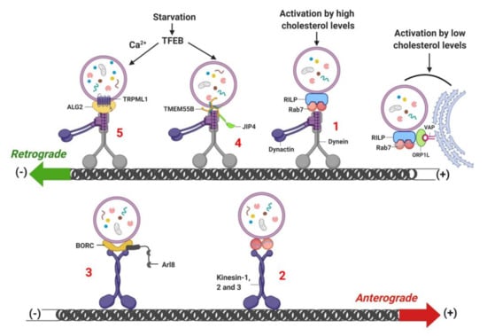 Retrograde- and anterograde-dependent lysosome mobilization. Lysosomes move from the cell periphery towards the perinuclear region in a retrograde manner. (1) The retrograde movement of the lysosome is initiated by RILP-Rab7-dependent recruitment and activation of dynein-dynactin, enabling the transport of lysosomes to minus-end direction. (2) While anterograde movement transport lysosomes from the perinuclear to the cell periphery, which requires kinesin-1, 2 and 3 motor proteins. (3) Anterograde movement of lysosomes also requires BLOC-1-related complex (BORC)-dependent recruitment of Arl8, which activates the kinesin proteins. (4) and (5) starvation-induced activation of TFEB increases the transcription of TRPML1 and TMEM55B to trigger lysosome mobilization in a retrograde manner via interaction with ALG2 (an EF-hand-containing protein, serve as lysosomal Ca2+ sensor) and JIP4 (C-Jun-amino-terminal kinase-interacting protein 4), respectively. Low cellular cholesterol levels restrict lysosomes at the plus end, which is mediated by the interaction between lysosomal RILP and Rab7 with VAP and ORP1L on ER membrane.