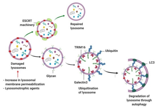 Lysosomal autophagy also plays an important role in breaking down lipid droplets via a process referred to as “lipophagy” [200]. Lipophagy was first described in hepatocytes and is indispensable for TAG breakdown as Atg7−/− mice displayed hepatic TG accumulation [201,202]. In addition to lipophagy, mitophagy ensures mitochondrial quality control by degrading dysfunctional mitochondria and maintaining functionally-active mitochondria [203,204,205]. Dysfunctional mitochondria that are unable to handle ROS overload are targeted for mitophagy by a PTEN-induced putative kinase 1 (PINK1)-Parkin mediated mechanism [206]. Specifically, PINK1 protein content is increased on the mitochondrial outer membrane, which signals Parkin-mediated ubiquitination of PINK1 molecule [206]. Ubiquitinated PINK1 molecules are targeted by ubiquitin cargo receptors p62/SQSTM1 and NBR1 [207,208]. Similar to mitochondria, damaged lysosomes are also subjected to repair or clearance albeit with assistance from ESCRT machinery-dependent sorting complex. The process of degrading damaged lysosomes via selective macroautophagy is termed as “lysophagy” [209,210,211]. Impaired lysosomal homeostasis is observed when lysosomes are damaged due to increased lysosomal membrane permeabilization, or lysosomal stress induced by lysosomotrophic agents [212,213]. Upon injury, damaged lysosomes efflux their luminal Ca2+ stores and activate the lipid-binding activity of the ESCRT complex, which is essential to repair lysosomes by reacidifying the lysosomal lumen and replenishing the lysosomal hydrolases [210]. Prior studies suggest that damaged lysosomes expose luminal glycan to the cytosol, which is sensed by galectin-3 and recruits E3 ubiquitin ligase TRIM16 to trigger ubiquitination of the damaged lysosomes [209,214]. Following the ubiquitination of lysosomes, the autophagic machinery is activated to initiate lysophagy (Figure 7) [209,214].