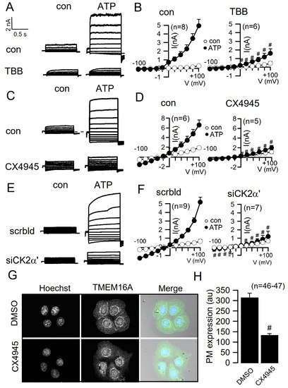 TMEM16A is a Ca2+-activated Cl− channel that is activated through stimulation of G-protein coupled receptors (GPRCs) that couple to phospholipase C, such as ATP-activated purinergic receptors. Stimulation of CFBE cells with extracellular ATP does increase intracellular Ca2+, which in turn will activate TMEM16A [42,44]. As shown in Figure 2, ATP activated TMEM16A whole cell currents in CFBE cells. Activation was strongly suppressed by preincubation of the cells for 30 min with the CK2 inhibitor TBB (Figure 2A). The summary of these experiments is shown in Figure 2B as current/voltage relationships of ion currents activated in control cells (left) and in TBB-treated cells (right). We also found that the CK2 inhibitor CX4945 suppressed ATP-induced whole cell currents even more potently than TBB (Figure 2C,D). In contrast, acute application of CX4945 to pre-activated TMEM16A did not clearly inhibit whole cell currents. Finally, knockdown of CK2α’ (siCK2α’) strongly attenuated TMEM16A currents stimulated by ATP (Figure 2E,F). Similar to knockdown of CK2α’ (Figure 1D), CX4945 also inhibited membrane expression of TMEM16A (Figure 2F,G).