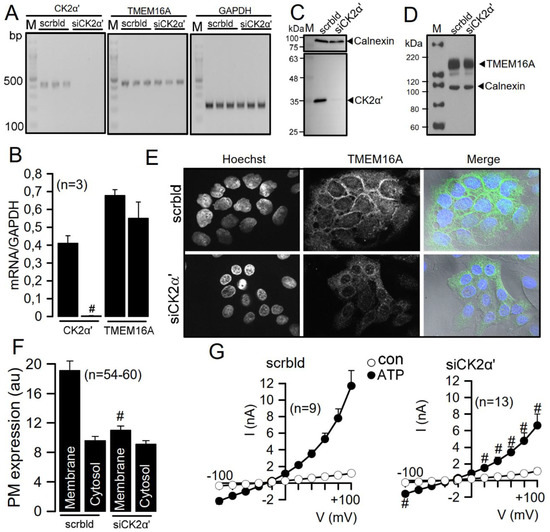 Role of CK2 for plasma membrane expression of TMEM16A in Cal33 head and neck cancer cells. (A,B) RT-PCR and densitometric analysis indicating successful knockdown of CK2α’ by siRNA for CK2α’ in Cal33 head and neck cancer cells (#significant inhibition, unpaired t-test; p = 0.01). Knockdown of CK2α’ did not inhibit transcription of TMEM16A. (C,D) Western blot analysis indicating successful knockdown of CK2α’ but unaffected expression of TMEM16A. (E,F) Plasma membrane (PM) expression of TMEM16A expressed endogenously in Cal33 cells and inhibition of PM expression by knockdown of CK2α’ (#significant inhibition, unpaired t-test; p = 0.00000002). (G) Current/voltage relationships of ATP-activated TMEM16A whole cells currents, indicating inhibition of TMEM16A by knockdown of CK2α’ (#significant inhibition, unpaired t-test; p = 0.01). Mean ± SEM. In parentheses are numbers of experiments.