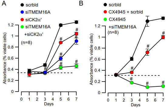 Inhibition of proliferation by knockdown of CK2α’ and TMEM16A. (A) Cell proliferation assessed in MTT assays and shown as absorbance. Both siRNA-knockdown of CK2α’ and TMEM16A inhibited cell proliferation (#significant inhibition, unpaired t-tests; p = 0.0001). Simultaneous knockdown of CK2α’ and TMEM16A had a more pronounced inhibitory effect on cell proliferation (#significant inhibition, unpaired t-test; p = 0.0015). (B) Inhibition of cell proliferation by the CK2-inhibitor CX4945 (20 µM) and additional inhibitory effect of TMEM16A-knockdown (#significant inhibition, unpaired t-test; p = 0.0001). Mean ± SEM. In parentheses are numbers of experiments.