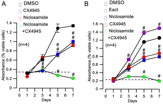 - Lee, M.C.; Chen, Y.K.; Hsu, Y.J.; Lin, B.R. Niclosamide inhibits the cell proliferation and enhances the responsiveness of esophageal cancer cells to chemotherapeutic agents. Oncol. Rep. 2020, 43, 549–561. [Google Scholar] [CrossRef] [PubMed]