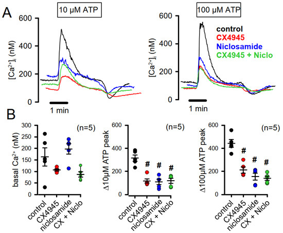 TMEM16A has a pronounced impact on intracellular Ca2+ ([Ca2+]i) signaling, as reported earlier, which is explained by its interaction with the endoplasmic reticulum (ER) inositolphosphate receptor IP3R and possibly by the impact of TMEM16A-mediated Cl− transport on Ca2+ signaling [40,46,47]. Because intracellular Ca2+ is a major regulator of cell proliferation, we examined if inhibition of TMEM16A by niclosamide exerts similar effects on intracellular Ca2+ signaling in Cal33 cells. Niclosamide did not change basal intracellular Ca2+ concentrations but strongly attenuated Ca2+ rise, induced by 10 and 100 µM ATP, respectively (Figure 6). It is notable that the CK2-inhibitor CX4945 also strongly reduced intracellular Ca2+ levels. This previously unrecognized effect of CX4945 on intracellular Ca2+ is likely to contribute to its antiproliferative/anticancer effects. Simultaneous inhibition of TMEM16A and CK2 did not further increase the inhibitory effect on [Ca2+]i. Taken together, blocking CK2 and TMEM16A inhibits cell proliferation, partially by overlapping mechanisms. Because inhibition of both pathways significantly augments inhibition of cell proliferation, it may be considered to use CX4945 and niclosamide simultaneously in patients with cancer.