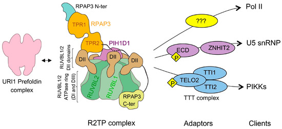 R2TP is an HSP90 co-chaperone made of four different subunits (see later), one of which, RPAP3, is a protein containing two TPR domains that interact with HSP90 and Heat shock protein 70 (HSP70) [2,3,4]. The R2TP complex was first described in Saccharomyces cerevisiae and it was later found in mammalian cells [4,5,6]. The R2TP complex works together with HSP90 in the stability and assembly of Pol II [7], small nucleolar ribonucleoproteins (snoRNPs) [8], and complexes of the PIKK family of kinases, including mTOR complexes [9,10]. Evidence suggests that R2TP also participates in the assembly and activation of other large macromolecular assemblies, such as U5 snRNP, the TSC1-TSC2 tuberous sclerosis complex, and possibly several others [6,11,12]. Current models propose that R2TP brings together clients and HSP90, facilitating the action of the chaperone on the client.