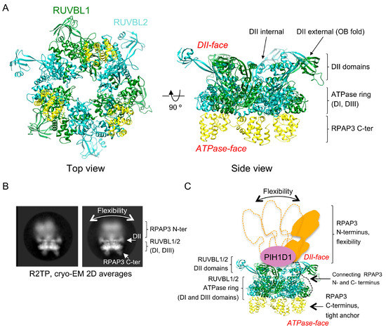 In 2017, two cryo-EM structures of yeast R2TP (Rvb1p-Rvb2p-Tah1p-Pih1p) reconstructed at medium resolution revealed that Rvb1p-Rvb2p formed a hexameric ring that scaffolds a Tah1p (yeast RPAP3 homologue) in complex with Pih1p (yeast PIH1D1 homologue) [38,39]. Pih1p and Tah1p were located at the DII face of the ATPase ring and as a consequence, the client recruitment PIH domain of Pih1p and the TPR domain in Tah1 necessary for HSP90 recruitment were in proximity.