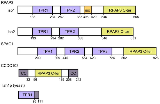 RPAP3 exists in two isoforms, with isoform 2 being shorter as it lacks few residues essential for the interaction of RPAP3 with PIH1D1 [27]. In addition, two other human proteins, SPAG1 and CCDC103, contain domains with homology to the RPAP3 C-terminal domain [27] (Figure 3). SPAG1 participates in the assembly of dynein arms and contains three rather than two TPR domains and a RPAP3 C-terminal-like domain at the C-terminus [41,42]. CCDC103 is a smaller protein comprising an RPAP3 C-terminal-like domain located at the center rather than at the C-terminal end of the protein and flanked by coiled coils domains. CCDC103 is also involved in the assembly of the outer dynein arms on ciliary axonemes [43]. In vitro assays revealed that CCDC103 self-assemble into oligomers and a short disordered region (residues 68–94) adjacent to the RPAP3 C-terminal-like domain is sufficient to mediate dimer formation [44]. Residues 93 to 242 that include the RPAP3 C-terminal domain of CCDC103 (residues 96–189) also revealed oligomeric properties in vitro. Several deleterious mutations in CCDC103 are found in primary ciliary dyskinesia (PCD) and the related situs inversus disease, suggesting a critical role of CCDC103 in the assembly of dynein arms on ciliary axonemes [45]. A mutation found in PCD and situs inversus disease is located specifically in the CCDC103 RPAP3 C-terminal domain (His154Pro), yielding an unstable protein in vitro [46].