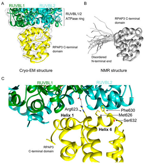 The atomic structure of the RPAP3 C-terminal domain has been determined as part of R2TP using cryo-EM [37] (Figure 4A) as well an individual domain using NMR [27] (Figure 4B). Cryo-EM of the human R2TP complex revealed that the RPAP3 C-terminal domain is a bundle of eight α-helices interacting with RUVBL2 (Figure 4A). Cryo-EM, cross-linked mass spectrometry, and NMR suggest that the RPAP3 C-terminal domain is preceded by a long unstructured region that connects the TPR and RPAP3 C-terminal domains through the outer rim of the RUVBL1-RUVBL2 ring [27,37] (Figure 2C). The NMR structure of the RPAP3 C-terminal domain mostly agrees with the conformation of the domain described by cryo-EM (Figure 4B). Recently, we have provided a detailed comparison and analysis of the two structures [40]. Observed minor discrepancies could be due to differences in the conformation of an isolated domain in solution, and when the same domain is in the context of the complete RPAP3 protein in complex with the rest of the components of R2TP.