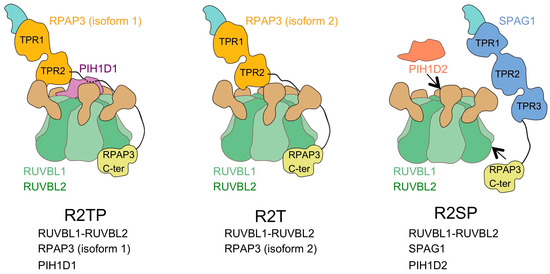 In summary, RPAP3 C-terminal-like domains allow the interaction between an RPAP3-like protein and the RUVBL1-RUVBL2 ATPases forming several distinct complexes, collectively named as R2TP-like [27] (Figure 5). The functions of these R2TP-like complexes have not been studied in detail yet, but it has been suggested that some of these could have tissue-specific roles and specificity towards some clients.