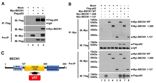 It has been reported that p62 plays an inhibitory role in TLR4 signaling through interrupting the association of TRAF6 with ECSIT, eventually leading to inhibition of NF-κB activation [13]. TRAF6 is an essential regulator for the induction of NF-κB and autophagy in TLR4 signaling [14,15,16,17,18]. Based on these earlier reports, we asked whether p62 is involved in TLR4-induced activation of autophagy. To investigate this, we first examined the molecular association between p62 and autophagy regulator proteins, such as TRAF6 and BECN1, in TLR4 signaling. Myc-tagged p62 or Flag-tagged p62 expressing vector were transfected into HEK293T cells along with Flag-tagged TRAF6 or Myc-tagged BECN1 expressing vector, and then immunoprecipitation (IP) was performed with anti-Flag antibody. Consistent with a previous report [13], Flag-tagged TRAF6 precipitated with Myc-tagged p62 (Supplementary Materials Figure S1A, lane 4). Additionally, Flag-tagged p62 precipitated with Myc-tagged BECN1 (Figure 1A, lane 4). To determine the specific binding site of p62 to TRAF6 or BECN1, truncated mutants of TRAF6 or BECN1 were generated, and IP assay was performed between p62 and these truncated proteins (Supplementary Materials Figure S2A,B). As shown in Supplementary Materials Figure S3, Flag-tagged TRAF6 wild type (WT) and Flag-tagged TRAF6 truncated mutants were significantly precipitated with Myc-tagged p62 (Supplementary Materials Figure S3A, lane 6-8), suggesting that p62 interacts with the TRAF-C domain of TRAF6 (Supplementary Materials Figure S3B). The results were consistent with a previous report [13]. As well, Myc-tagged BECN1 WT and Myc-tagged BECN1 1-269 truncated mutant were precipitated with Flag-tagged p62 (Figure 1B, lane 6 and 7), whereas no significant interaction could be observed with Myc-tagged BECN1 1-127 truncations (Figure 1B, lane 8), indicating that p62 interacts with the coiled-coil domain of BECN1 (Figure 1C).