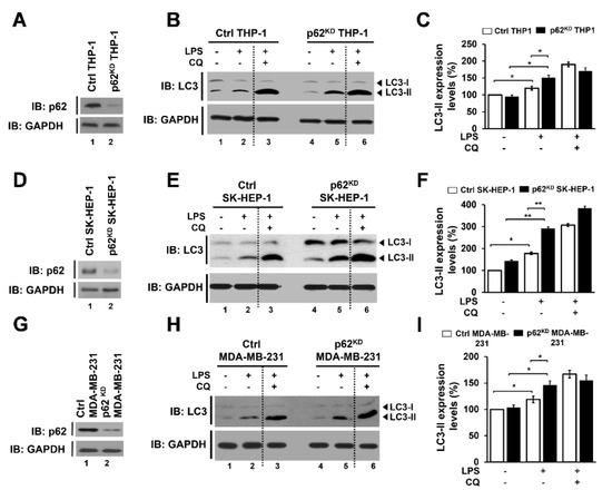 p62-deficient cells, p62KD THP-1, p62KD SK-HEP-1, and p62KD MDA-MB-231 cells, exhibit enhanced autophagy activation in response to TLR4 stimulation. (A) p62KD THP-1 cells were generated, and the knockdown efficacy of p62 was confirmed with anti-p62 antibody. (B,C) Ctrl and p62KD THP-1 cells were treated with or without vehicle or CQ (10 μM), in the presence or absence of LPS (10 μg/mL), for 6 h. Whole cell lysates were immunoblotted with anti-LC3A/B antibody and anti-GAPDH antibody as a loading control (B). The LC3II levels were analyzed with Image J program (C). Data shown are averages from a minimum of 3 independent experiments (± SEM). *, p < 0.05. (D) p62KD SK-HEP-1 cells were generated, and the knockdown efficacy of p62 was confirmed with anti-p62 antibody. (E,F) Ctrl and p62KD SK-HEP-1 were treated with or without vehicle or CQ, in the presence or absence of LPS. Whole cell lysates were immunoblotted with anti-LC3A/B and anti-GAPDH antibodies (E). The LC3II levels were analyzed with Image J program (F). Data shown are averages from a minimum of 3 independent experiments (± SEM). *, p < 0.05 and **, p < 0.01. (G) p62KD MDA-MB-231 cells were generated, and the knockdown efficacy of p62 was confirmed with anti-p62 antibody. (H,I) Ctrl and p62KD MDA-MB-231 were treated with or without vehicle or CQ, in the presence or absence of LPS. Whole cell lysates were immunoblotted with anti-LC3A/B and anti-GAPDH antibodies (H). The LC3II levels were analyzed with Image J program (I). Data shown are averages from a minimum of 3 independent experiments (± SEM). * p < 0.05.